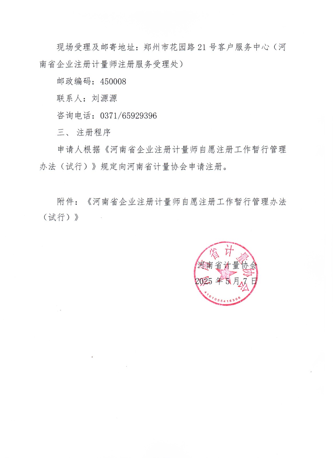 《河南省企业注册计量师注册自愿注册工作暂行管理办法(试行)》已于5月7日发布,受省局委托,河南省计量协会开展自愿注册服务工作。