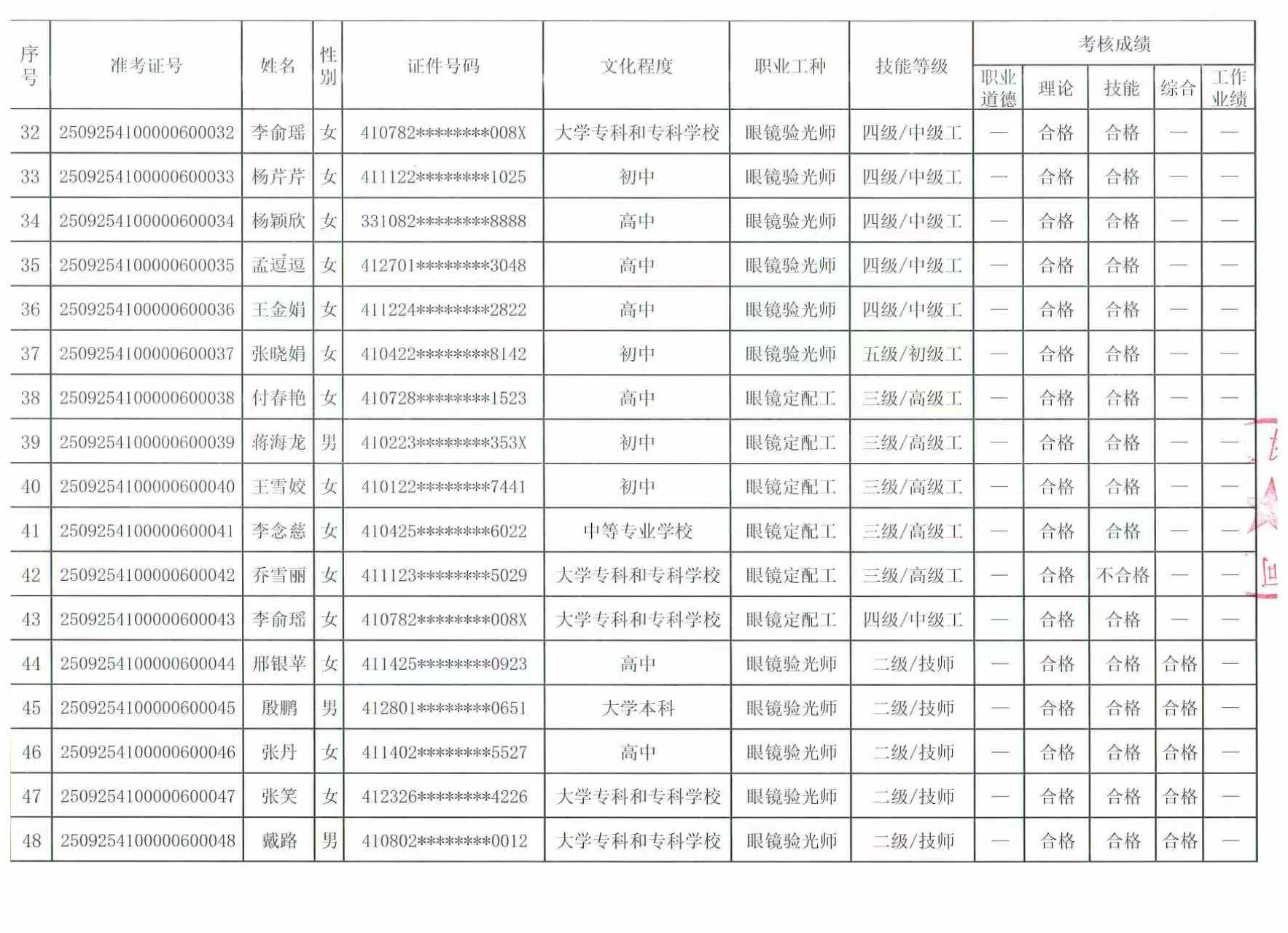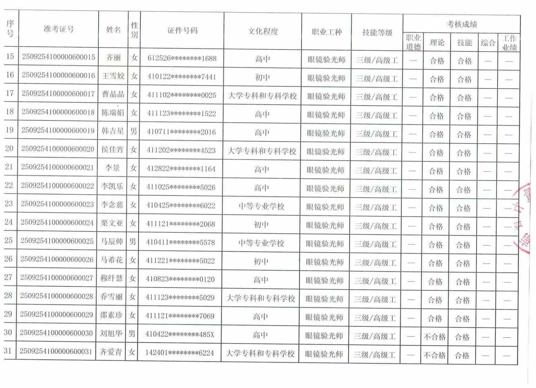 河南省计量协会眼镜验光师、眼镜定配工 职业技能等级评价考试成绩公示