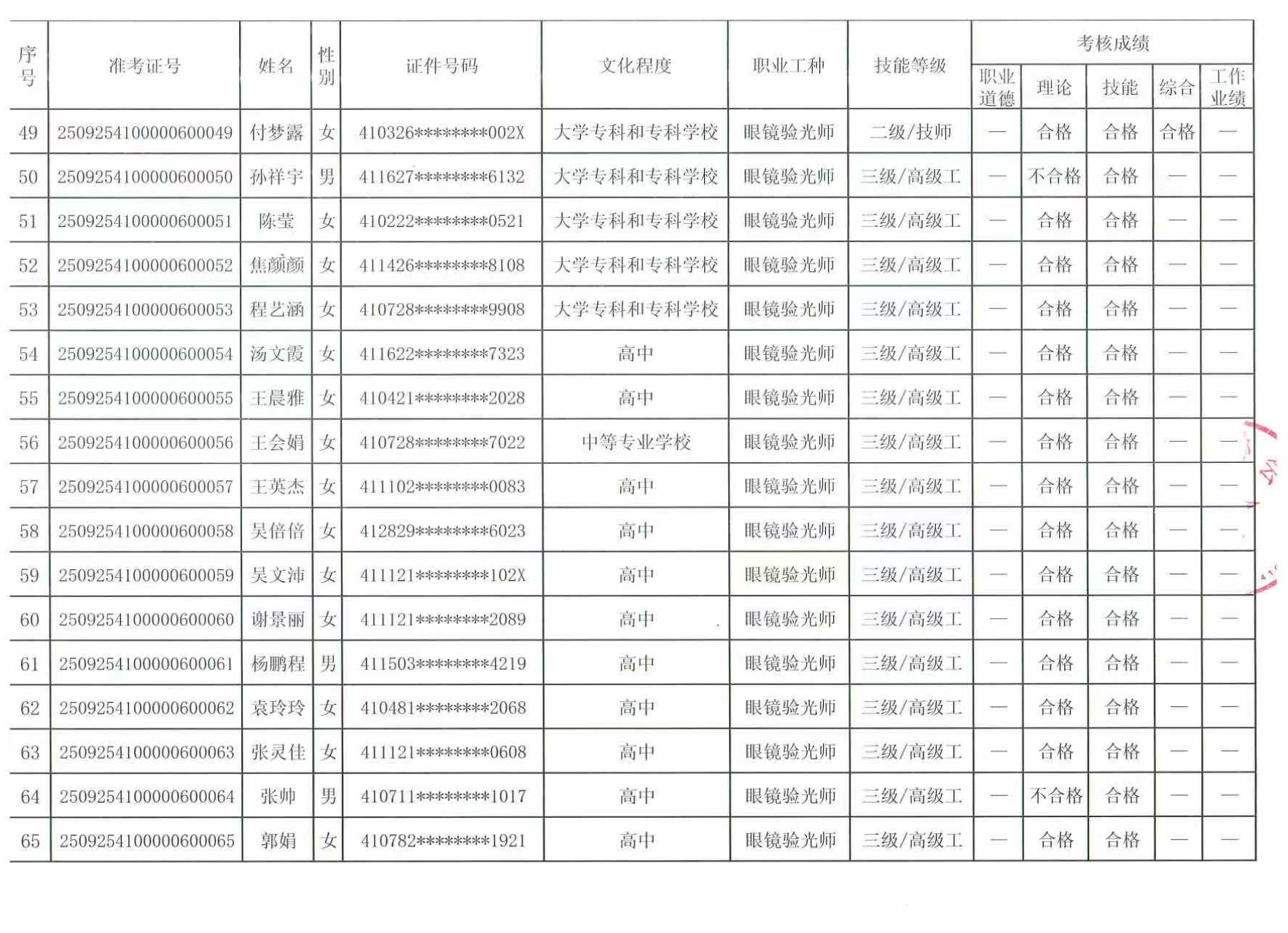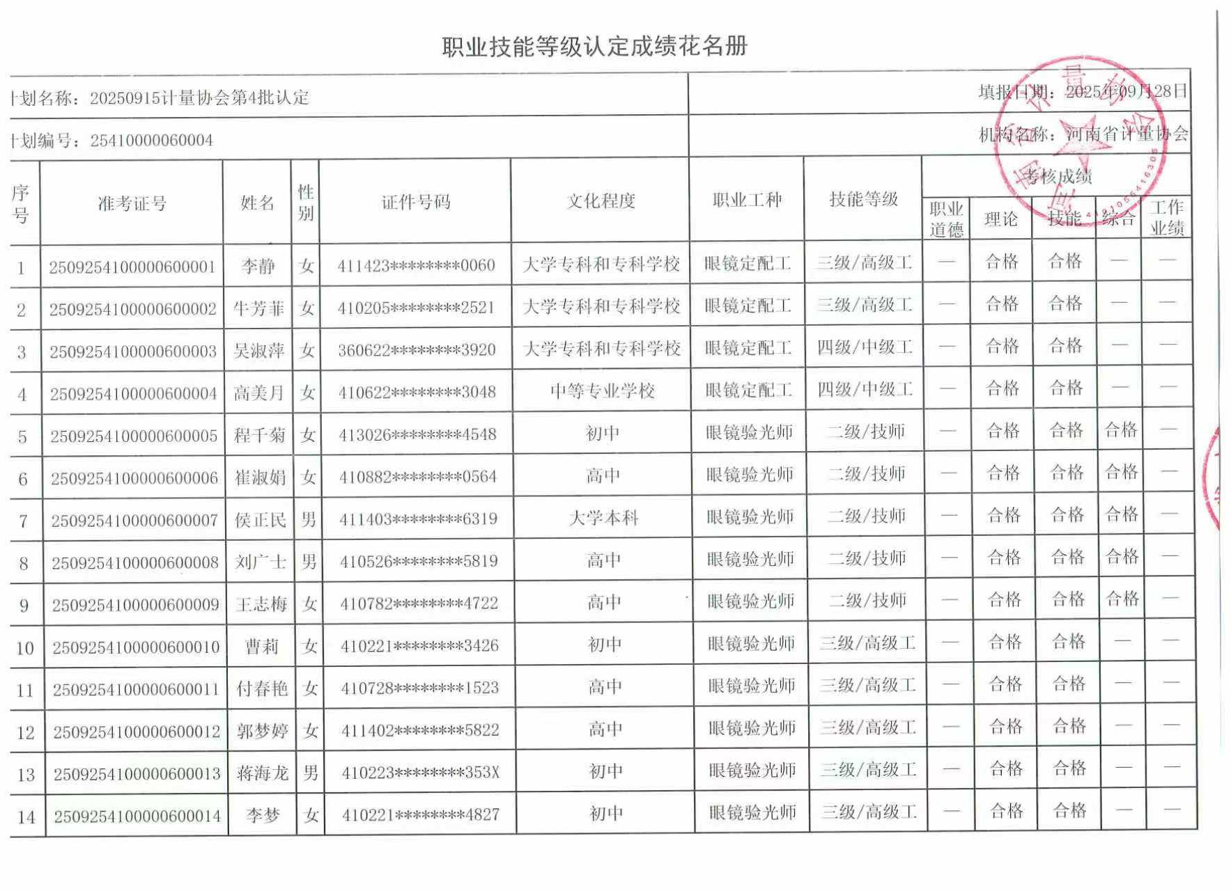 河南省计量协会于2025年09月25日进行了本年度眼镜验光师、眼镜定配工(共计74人)职业技能等级评价考试,现将考试成绩予以公示,公示时间为:2025年09月29日---2025年10月08日。