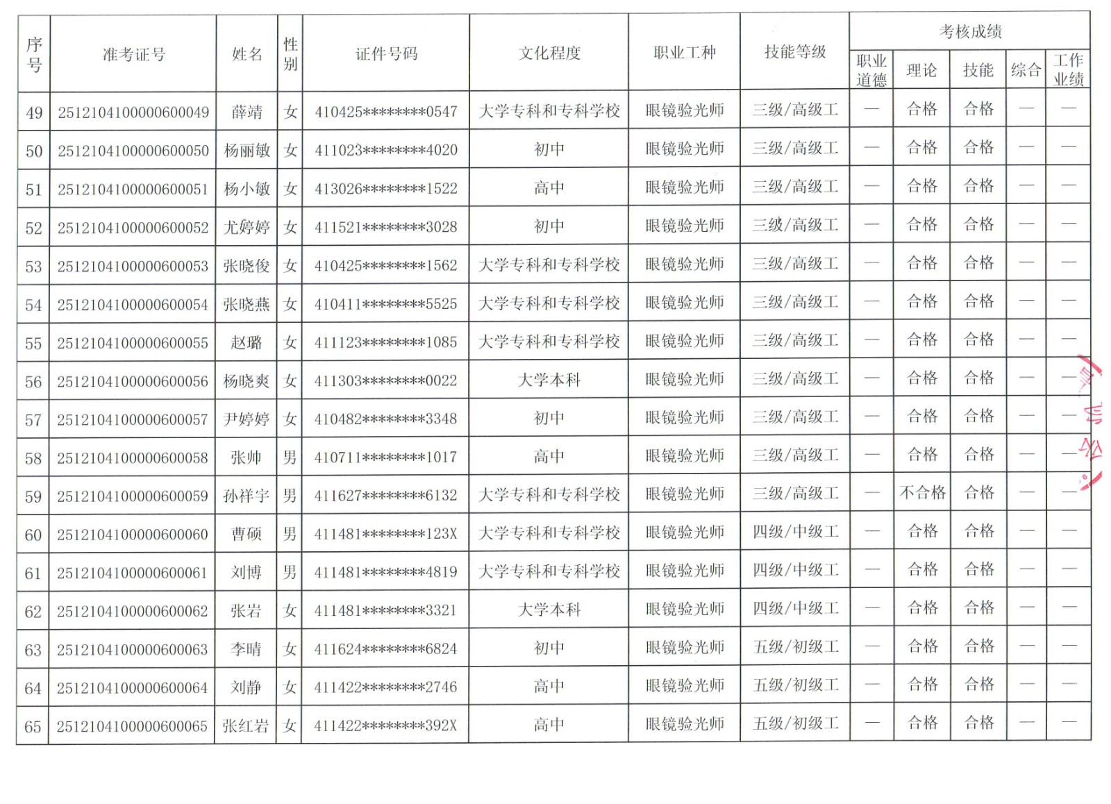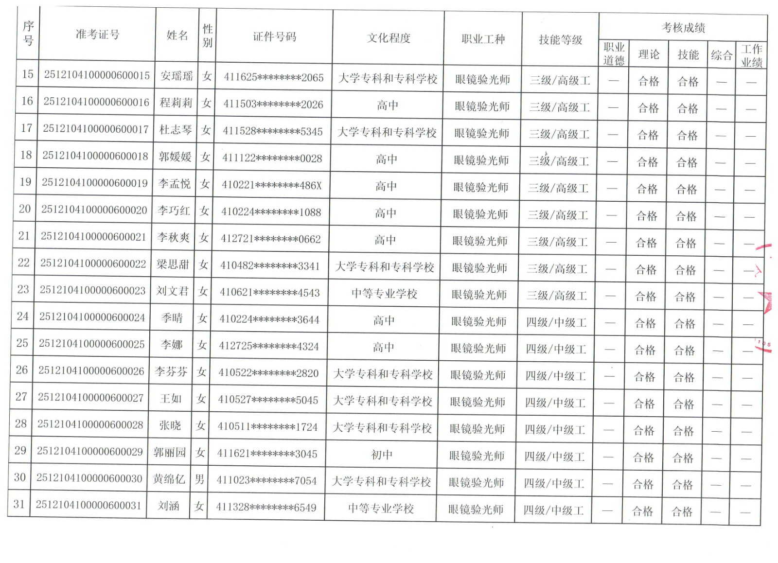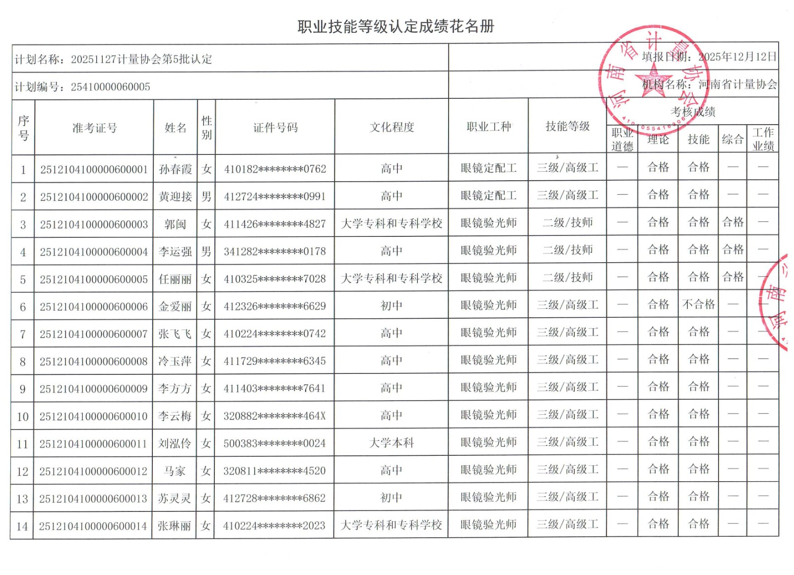 河南省计量协会于2025年12月10日进行了本年度眼镜验光师、眼镜定配工(共计67人)职业技能等级评价考试,现将考试成绩予以公示,公示时间为:2025年12月12日---2025年12月19日。
