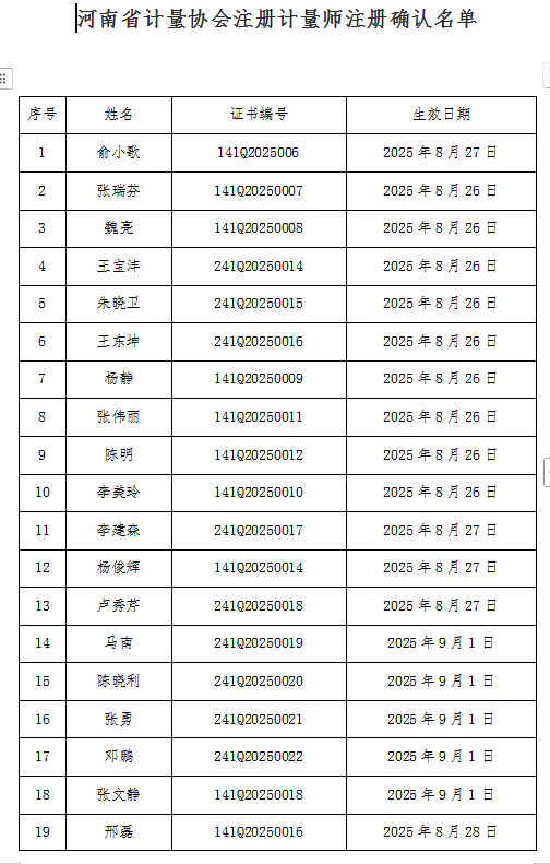 根据《河南省企业注册计量师自愿注册工作暂行管理办法(试行)》,经河南省计量协会审查考核,