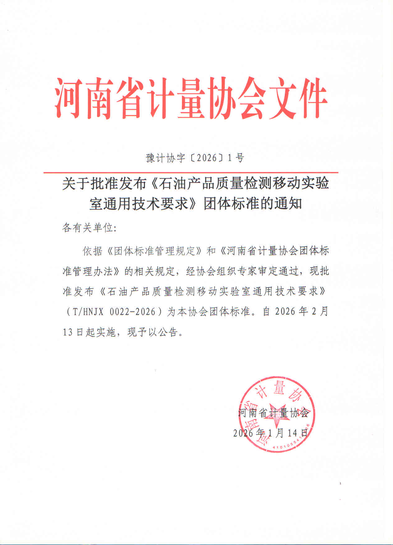 河南省计量协会关于发布《石油产品质量检测移动实验室通用技术要求》团体标准的公告