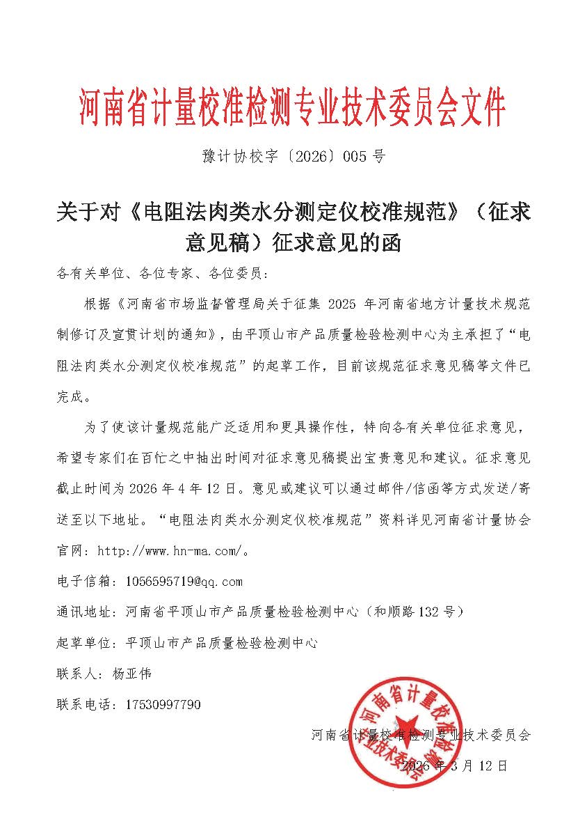 关于对《电阻法肉类水分测定仪校准规范》(征求意见稿)征求意见的函